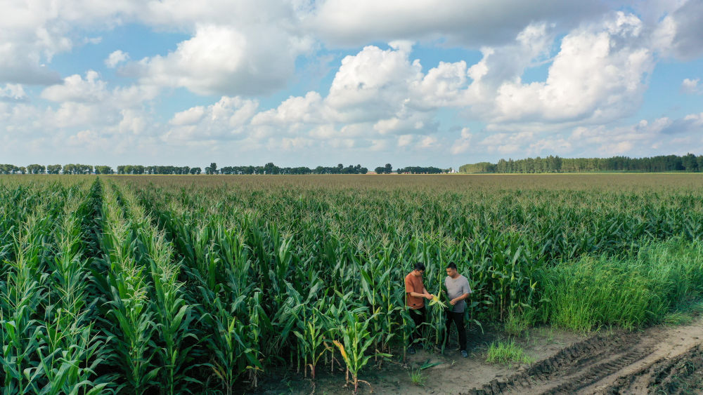 2024年8月8日,在吉林省梨樹縣孤家子鎮(zhèn)兩家子村,當(dāng)?shù)剞r(nóng)業(yè)發(fā)展服務(wù)站高級(jí)農(nóng)藝師蘭雨壯(左)與四平市強(qiáng)盛農(nóng)機(jī)農(nóng)民專業(yè)合作社負(fù)責(zé)人查看玉米長勢(無人機(jī)照片)。多年來,地處世界“黃金玉米帶”的全國產(chǎn)糧大縣吉林省梨樹縣,強(qiáng)化科技在農(nóng)業(yè)生產(chǎn)中的支撐作用,持續(xù)提升糧食和重要農(nóng)產(chǎn)品穩(wěn)產(chǎn)保供能力。