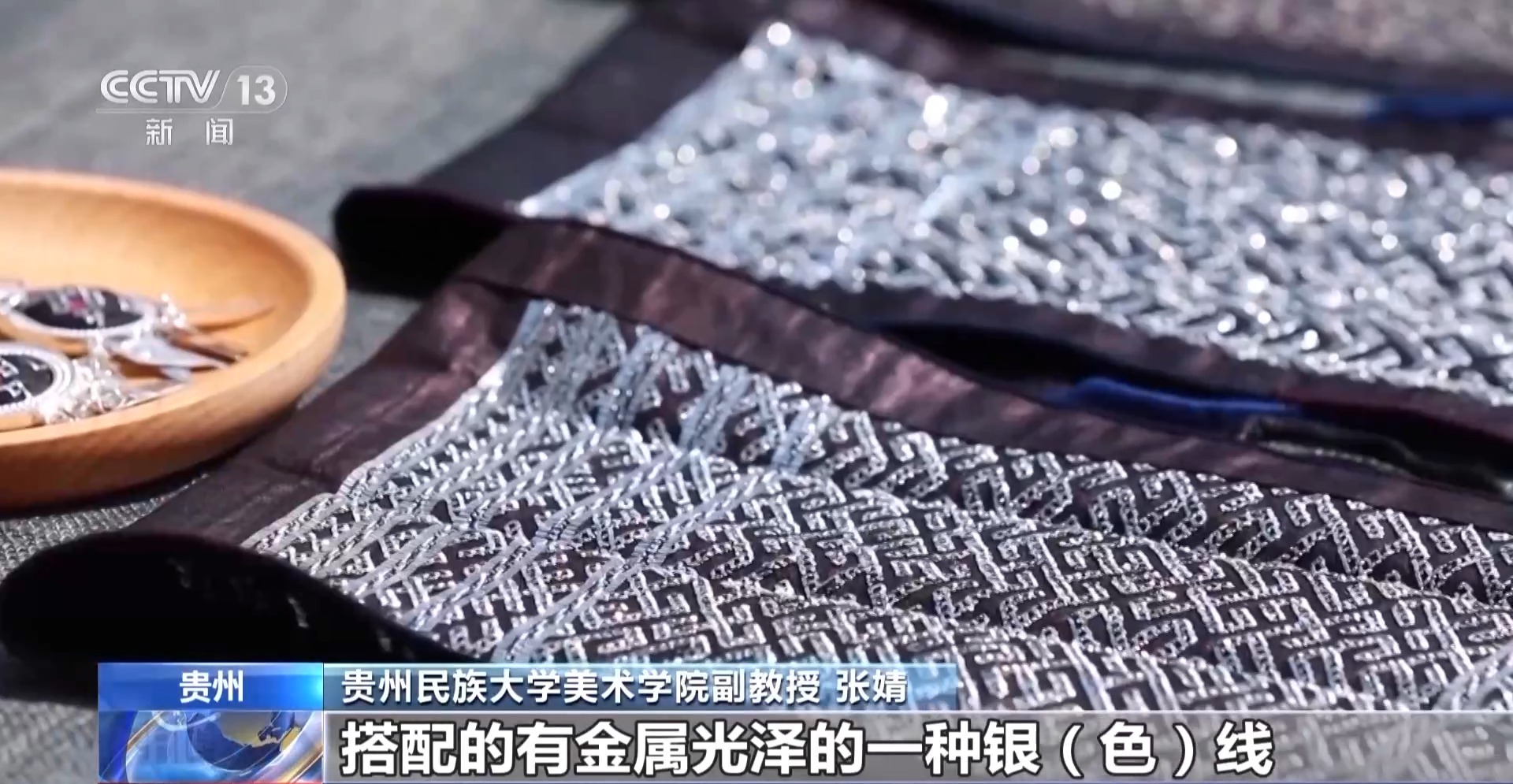 貴州民族大學(xué)美術(shù)學(xué)院副教授 張婧:錫繡會用到一些藏青色的底布、暗色系的絲線,搭配有金屬光澤的一種銀色線,以此形成強(qiáng)烈對比。對中國傳統(tǒng)刺繡、苗族刺繡來說,它的藝術(shù)風(fēng)格都是具有自己鮮明特征的。
