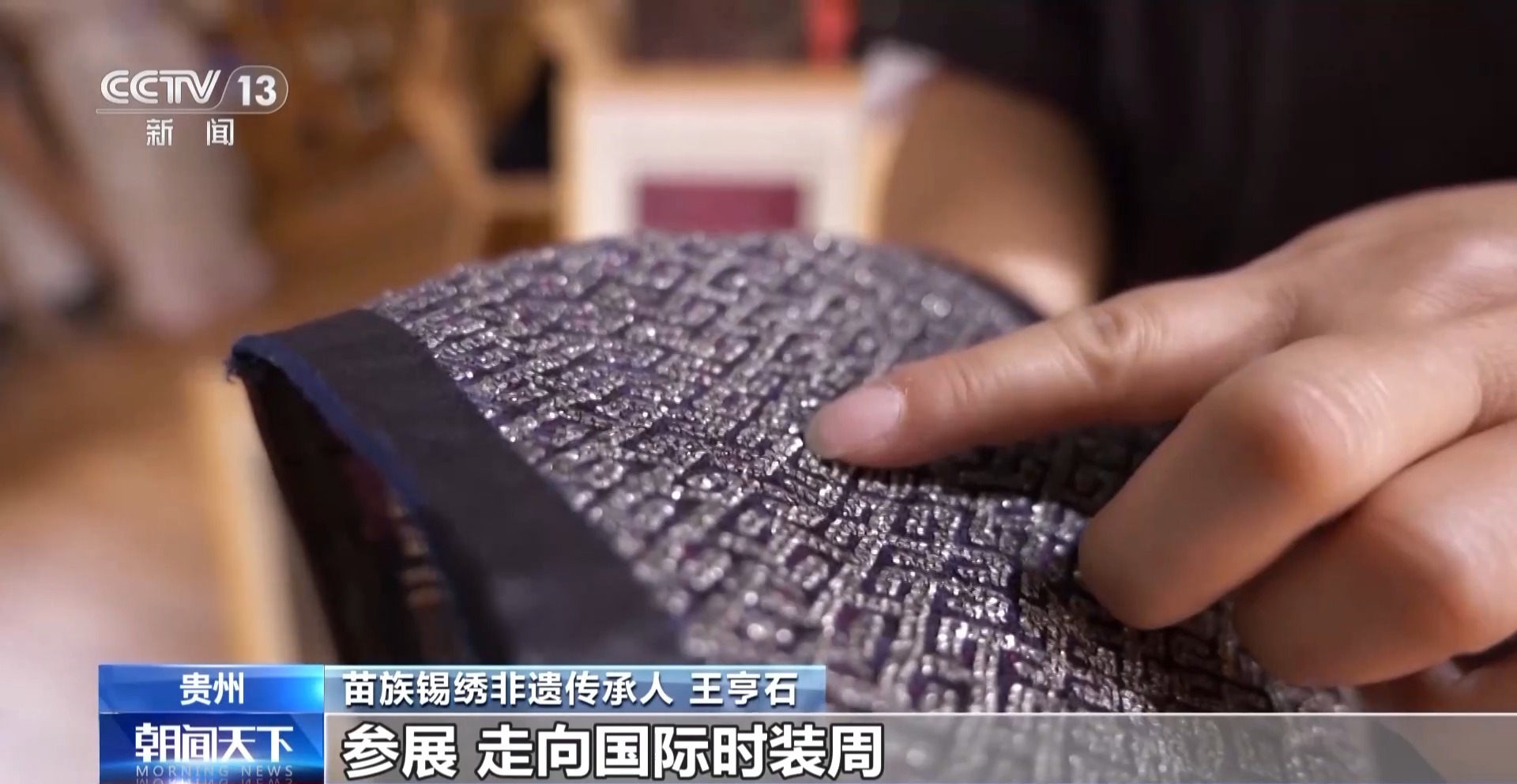 苗族錫繡非遺傳承人 王亨石:按照他要尺寸的大小自己繡出來,繡出來以后寄給他,他自己再設(shè)計出作品,參展,走向國際時裝周。我想生在大山里面幾百年的錫繡,今天能走上這么高的國際舞臺,我真的感到很高興而且很自豪。