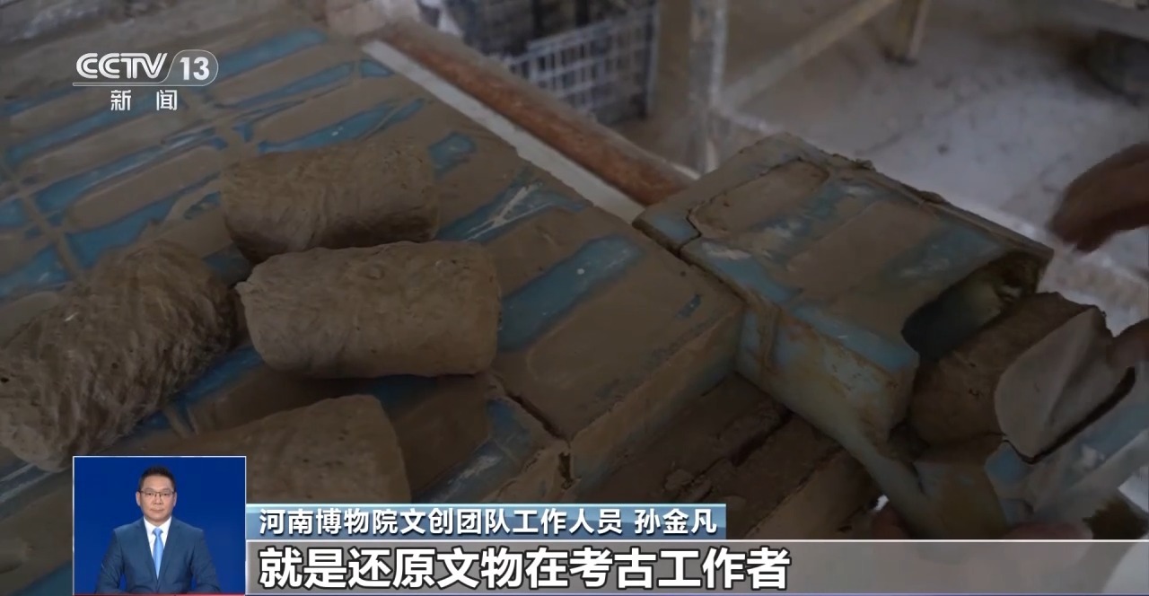 河南博物院文創(chuàng)團(tuán)隊(duì)工作人員 孫金凡:和泥巴、調(diào)配方、做試驗(yàn),每天都是灰頭土臉的,就是還原文物在考古工作者出土?xí)r的那一瞬間。同學(xué)就會問,還在村里面呢?我說對,還在那和泥巴。