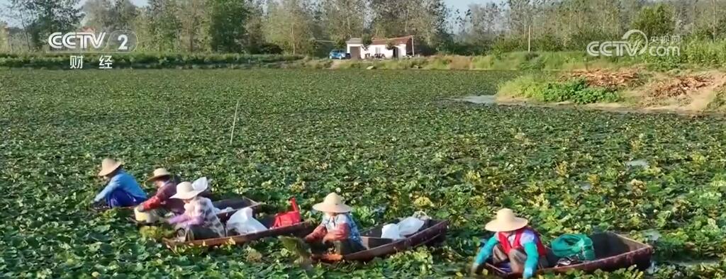 傍晚時(shí)分,采菱的村民劃著小船穿梭在碧波綠葉中,從水下扯起一根根菱角藤,采摘綠中帶粉的菱角。不一會兒,船艙就被塞得滿滿當(dāng)當(dāng)。