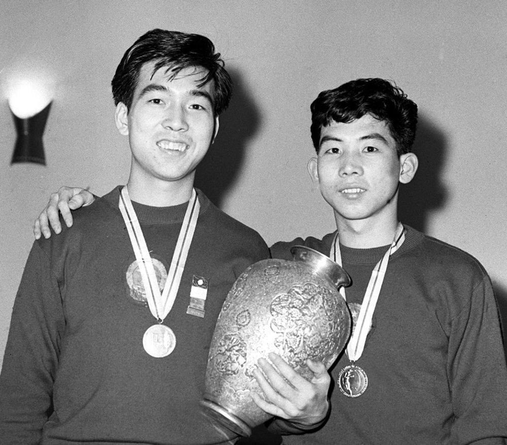 這是榮獲第27屆世界乒乓球錦標(biāo)賽男子雙打冠軍的中國選手張燮林(左)、王志良(資料照片)。新華社記者 張家驊 攝
