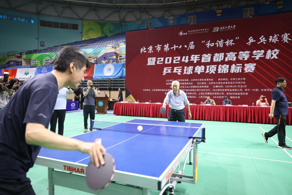 這是2024年6月1日,張燮林(后中)為北京市第十八屆“和諧杯”乒乓球賽暨2024年首都高等學(xué)校乒乓球單項錦標(biāo)賽開球。新華社發(fā)