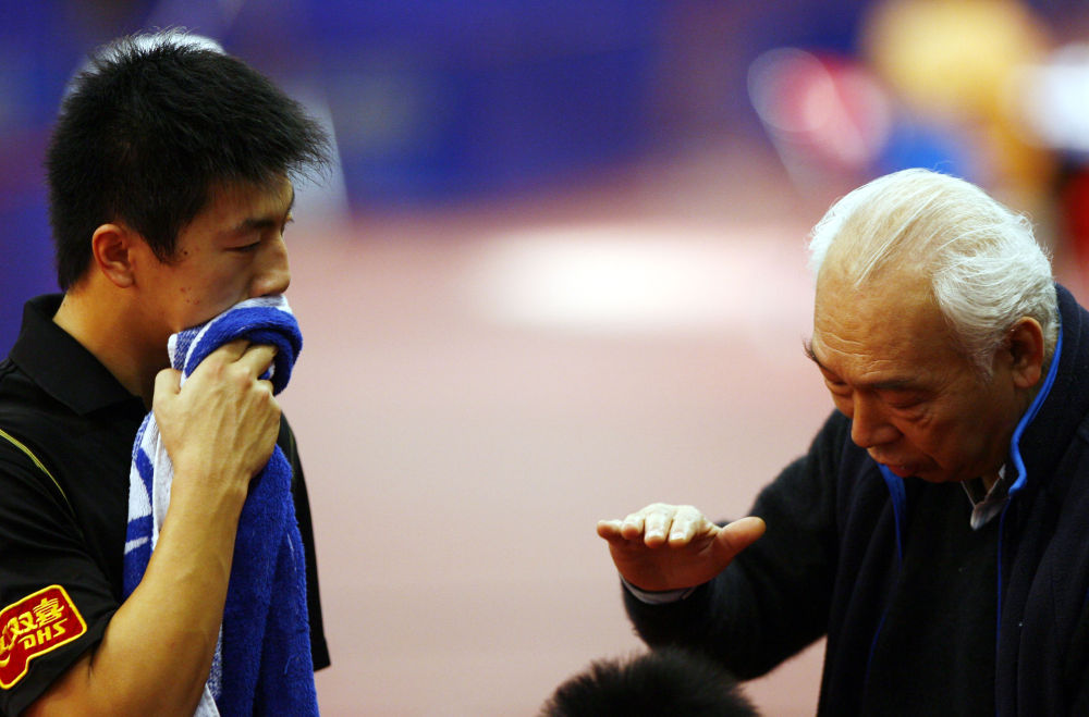 這是2007年2月9日,張燮林(右)在北京舉行的“直通薩格勒布”第49屆世乒賽單項賽國乒男隊選拔賽中為馬龍講解戰(zhàn)術(shù)要領(lǐng)。新華社記者 畢明明 攝
