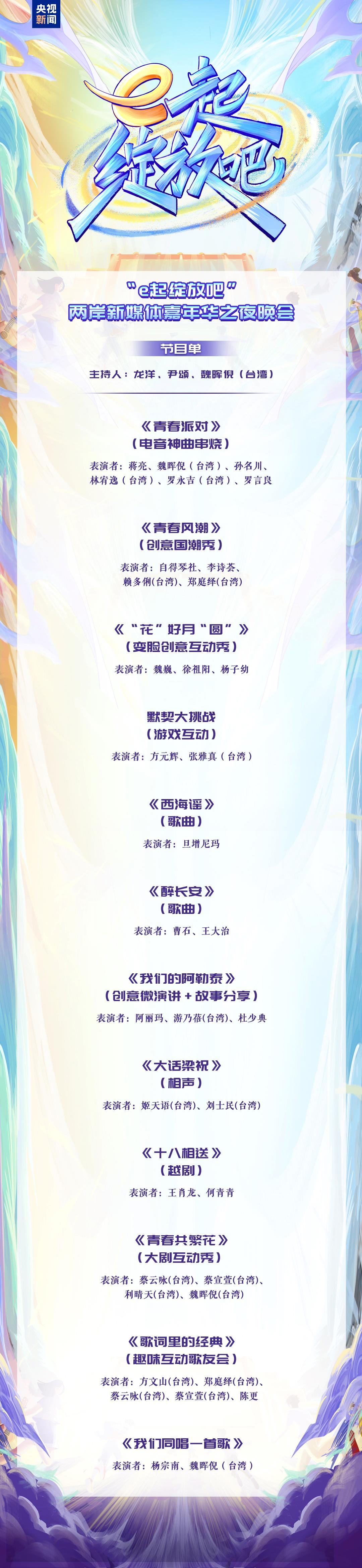 “e起綻放吧”兩岸新媒體嘉年華之夜晚會今晚(9月25日)20時將在看臺海、大灣區(qū)之聲、央視頻、央視新聞、央視財經(jīng)等平臺播出。來自兩岸的文化名人、網(wǎng)紅博主、青年代表以“才藝+故事”的融合表現(xiàn)形式,結合影視劇、國潮音樂、舞蹈、詩詞歌賦、旅游美食等文化元素,共尋文化記憶、共話青春故事、共融民族情感,共享一場心手相牽的青春盛宴。兩岸年輕人在晚會中同唱一首歌、同追一部劇、同創(chuàng)一首詩,展現(xiàn)兩岸交流交往、融合發(fā)展中的蓬勃青春力量。