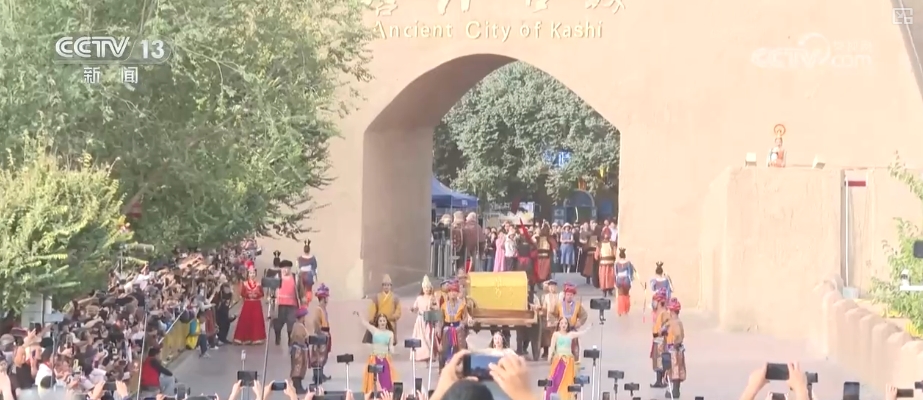 一大早,喀什古城的開城儀式迎來四面八方游客,具有喀什濃郁特色的開城迎賓舞吸引成千上萬的拍客們爭相拍攝。傍晚時分,在喀什古城街道的游客們感受著國慶節(jié)日來臨前的歡樂喜慶氛圍。