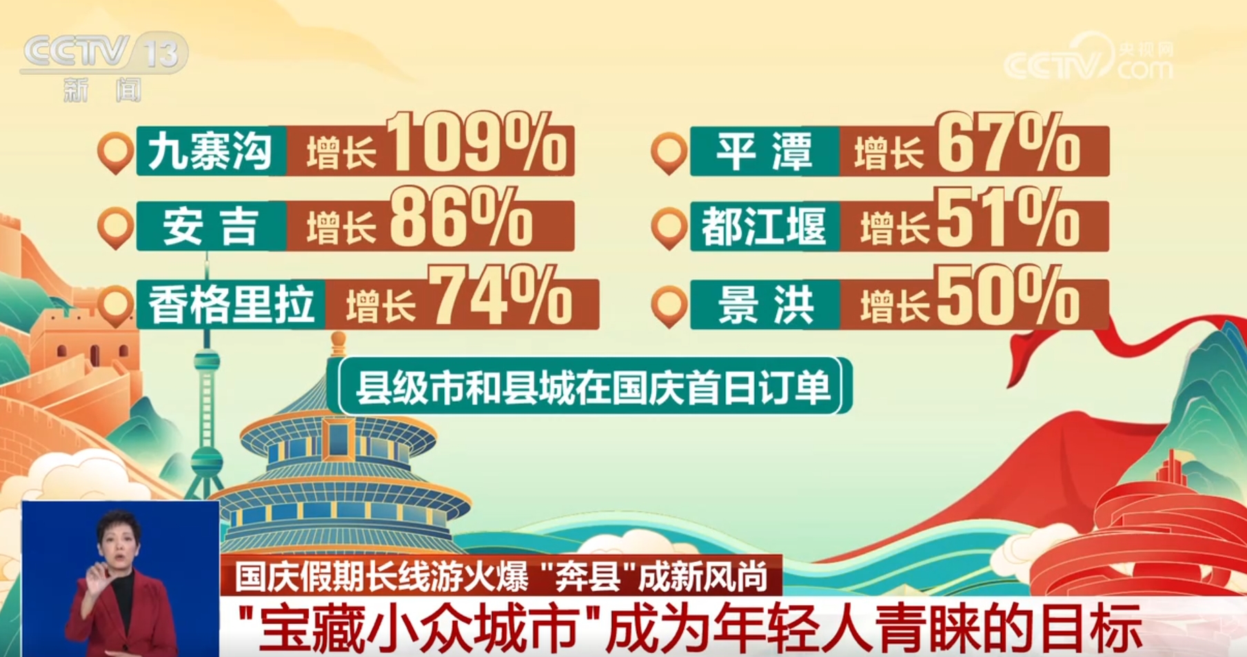從增速上看,低線、小眾旅游目的地增長(zhǎng)潛力巨大,“奔縣”旅游的人越來(lái)越多。九寨溝、安吉、香格里拉、平潭、都江堰、景洪等縣級(jí)市和縣城在國(guó)慶首日都分別實(shí)現(xiàn)訂單109%、86%、74%、67%、51%、50%的增長(zhǎng)。