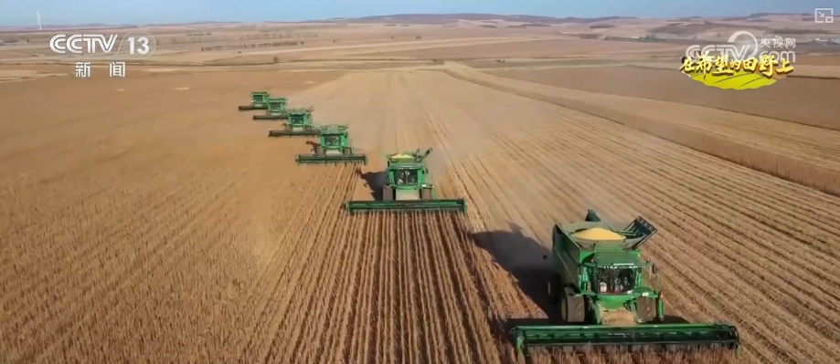 在呼倫貝爾甘河農牧場的大豆田里,6臺大型收割機在金色的田野里繁忙作業(yè),這里地勢開闊,每臺收割機每天可收割1000畝大豆。