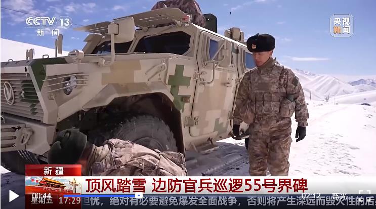 新疆 頂風(fēng)踏雪 邊防官兵巡邏55號界碑