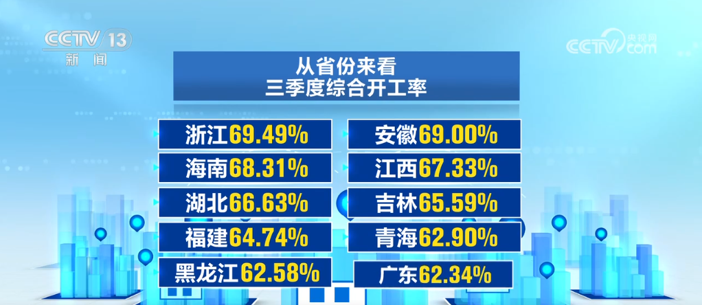 從省份來(lái)看,三季度綜合開工率排名前十的有浙江、安徽、海南等,且開工率都在60%以上,工程建設(shè)熱情高漲。