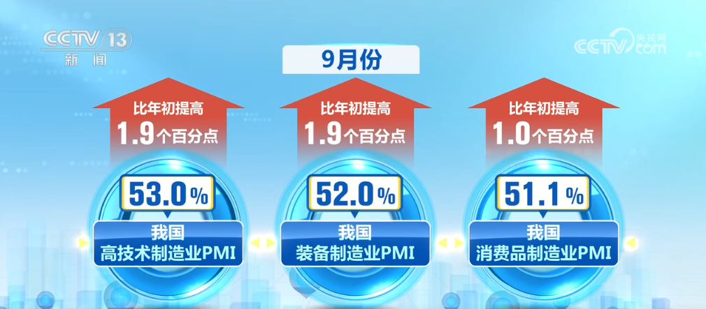 9月份,我國(guó)高技術(shù)制造業(yè)、裝備制造業(yè)和消費(fèi)品制造業(yè)PMI分別為53.0%、52.0%、51.1%,比年初提高了1.9個(gè)、1.9個(gè)、1.0個(gè)百分點(diǎn)。相關(guān)行業(yè)處于擴(kuò)張區(qū)間,景氣水平連續(xù)上升。