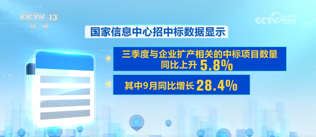 不僅工程建設(shè)在提速,作為項(xiàng)目落地的第一步,中標(biāo)數(shù)據(jù)也在快速增長(zhǎng)。國(guó)家信息中心招中標(biāo)數(shù)據(jù)顯示,三季度與企業(yè)擴(kuò)產(chǎn)相關(guān)的中標(biāo)項(xiàng)目數(shù)量同比上升5.8%,其中9月同比增長(zhǎng)28.4%,為今年以來(lái)最高增速,企業(yè)擴(kuò)產(chǎn)熱度回升明顯。