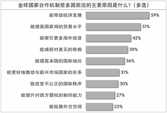在12國(guó)受訪者看來(lái),金磚機(jī)制受多國(guó)歡迎的最主要原因是它“能帶動(dòng)經(jīng)濟(jì)發(fā)展”,有近六成受訪者認(rèn)同此原因。過(guò)半受訪者認(rèn)為,“能提高國(guó)家間的貿(mào)易水平”是金磚機(jī)制受歡迎的原因。此外,能“吸引更多海外投資”“減輕對(duì)美元的依賴”“提高本國(guó)國(guó)際地位”等原因也獲得較多認(rèn)同。王友明對(duì)《環(huán)球時(shí)報(bào)》記者分析說(shuō):“開放、包容、合作、共贏的精神是金磚國(guó)家能夠走向‘大金磚’的根本原因,這四個(gè)要素缺一不可?!?/p>