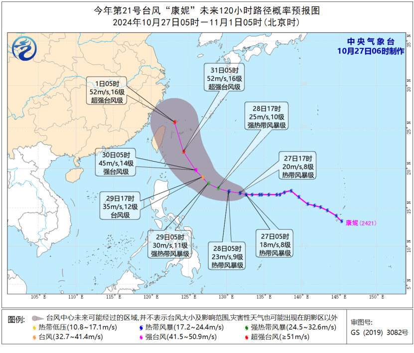預(yù)計(jì),“康妮”將以每小時(shí)10至15公里的速度向偏西方向移動。29日開始轉(zhuǎn)向西北方向移動,逐漸向臺灣島東部海面靠近,強(qiáng)度逐漸增強(qiáng),最強(qiáng)可達(dá)強(qiáng)臺風(fēng)級或超強(qiáng)臺風(fēng)級(48至55米/秒,15至16級)。