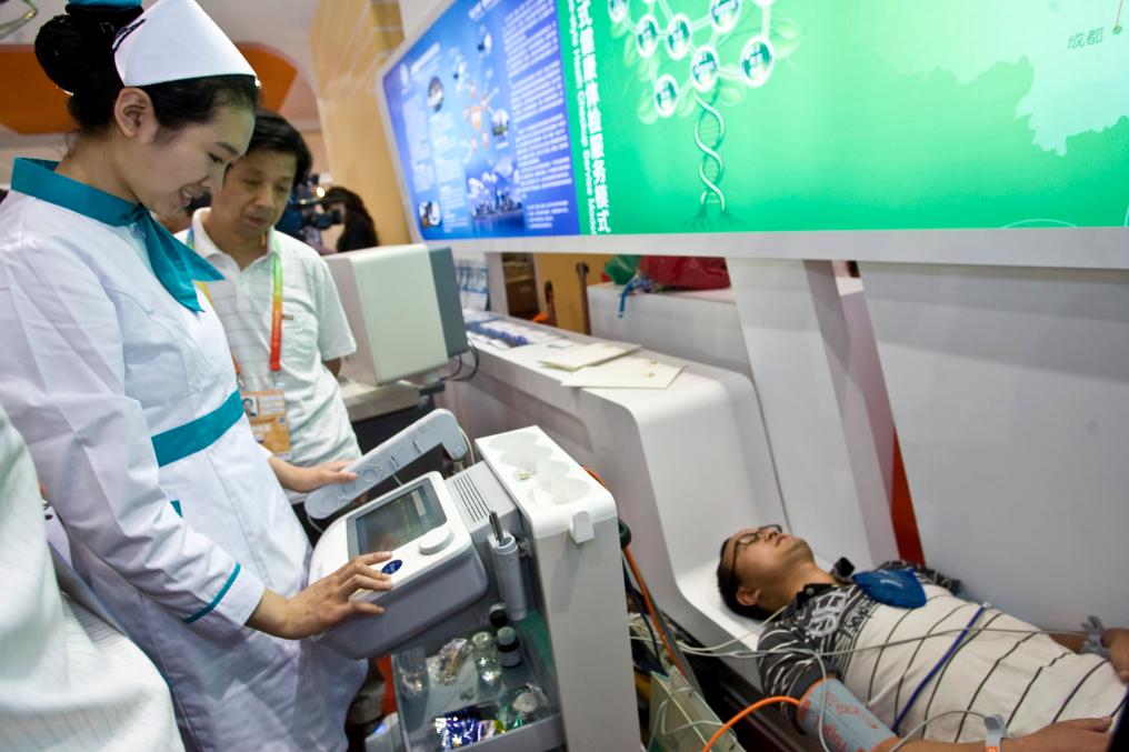 2012年5月28日,觀眾在首屆中國(北京)國際服務(wù)貿(mào)易交易會(huì)(簡(jiǎn)稱“京交會(huì)”,后發(fā)展為中國國際服務(wù)貿(mào)易交易會(huì),即“服貿(mào)會(huì)”)體驗(yàn)全方位健康體檢。新華社發(fā)(趙冰 攝)