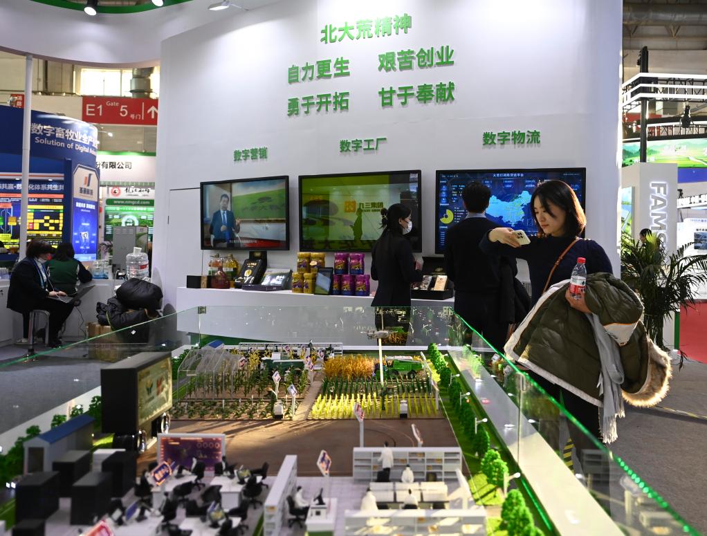 2023年11月30日,參觀者在首屆中國國際供應(yīng)鏈促進(jìn)博覽會(huì)(簡(jiǎn)稱“鏈博會(huì)”)綠色農(nóng)業(yè)鏈展區(qū)北大荒集團(tuán)展臺(tái)前觀看智慧育種解決方案。新華社記者 蔡湘鑫 攝