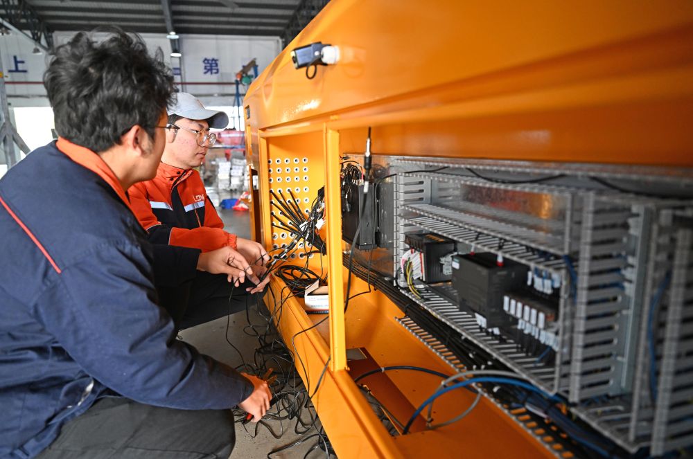 在位于天津市西青區(qū)的天津朗譽(yù)機(jī)器人有限公司生產(chǎn)車間內(nèi),工作人員在調(diào)試重載自動導(dǎo)引運(yùn)輸車。新華社記者 趙子碩 攝