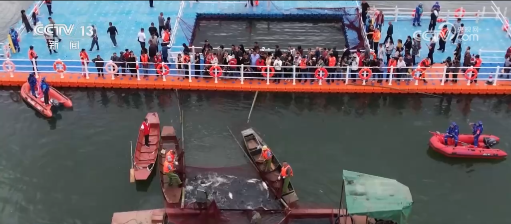 11月16日,江西宜春袁州區(qū)飛劍潭水庫迎來生態(tài)魚的冬季集中捕撈。隨著漁網(wǎng)逐漸收攏,魚躍歡騰,當(dāng)?shù)亟璐伺e辦各類活動(dòng),讓游客也體驗(yàn)魚兒豐收的喜悅。