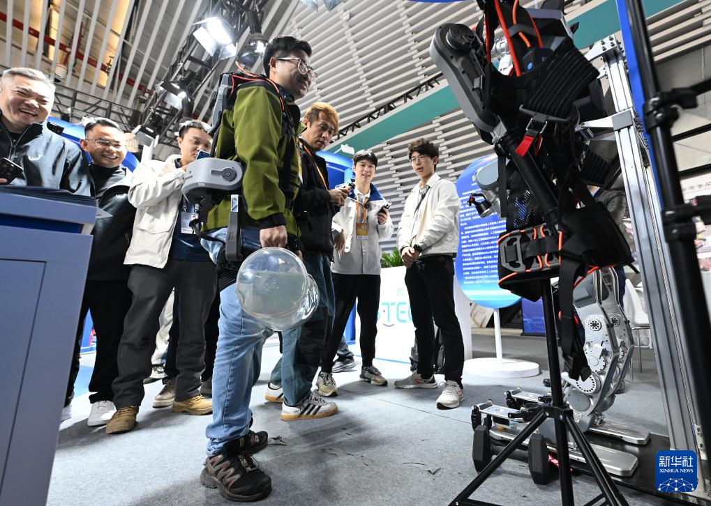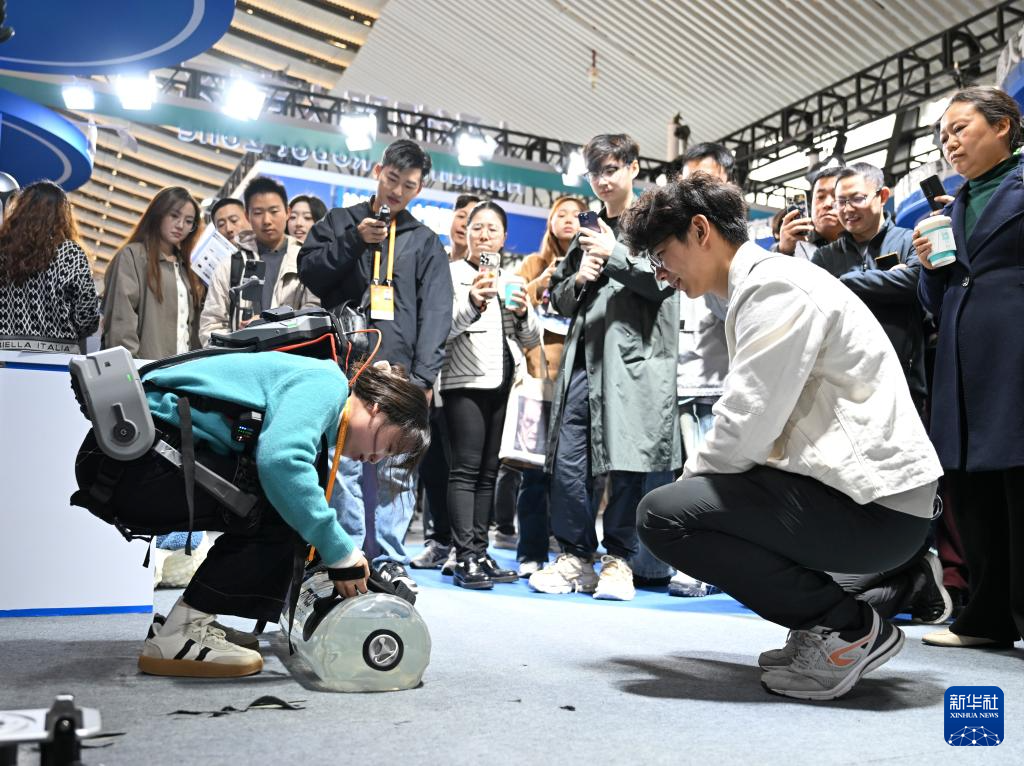 11月19日,在2024年世界互聯(lián)網(wǎng)大會(huì)“互聯(lián)網(wǎng)之光”博覽會(huì)上,參觀者體驗(yàn)外骨骼機(jī)器人協(xié)助搬運(yùn)重物。