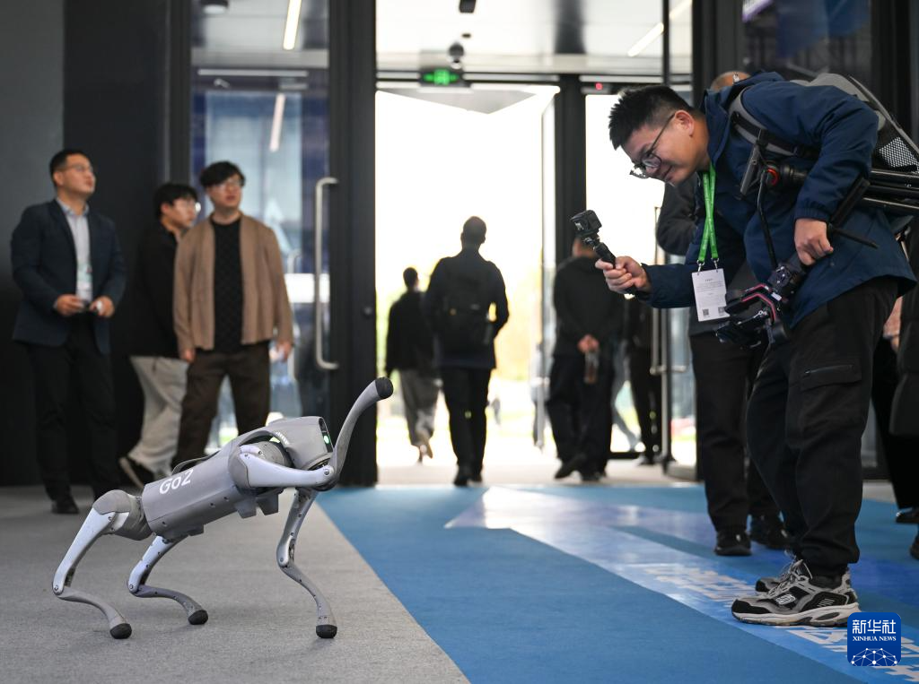 11月19日,在2024年世界互聯(lián)網(wǎng)大會(huì)“互聯(lián)網(wǎng)之光”博覽會(huì)上,參觀者與一款智能機(jī)器狗互動(dòng)。