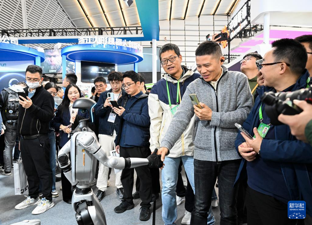 11月19日,在2024年世界互聯(lián)網(wǎng)大會(huì)“互聯(lián)網(wǎng)之光”博覽會(huì)上,一臺(tái)人形機(jī)器人(右一)與參觀者互動(dòng)。
