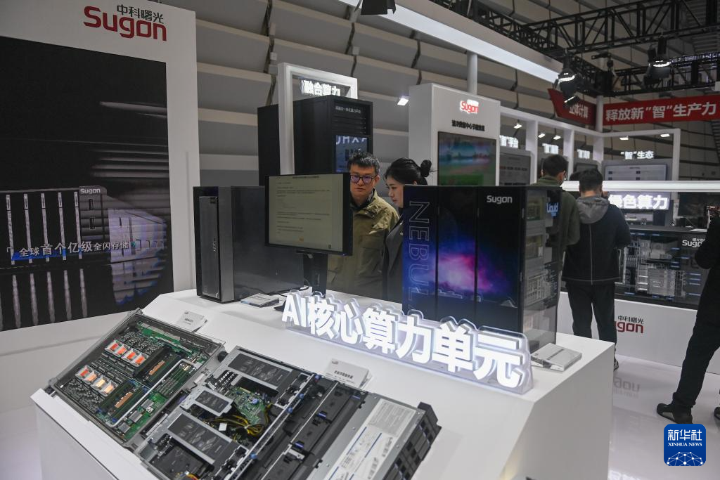 11月19日,在2024年世界互聯(lián)網(wǎng)大會(huì)“互聯(lián)網(wǎng)之光”博覽會(huì)上,觀眾在中科曙光展臺(tái)參觀AI核心算力單元的設(shè)備。