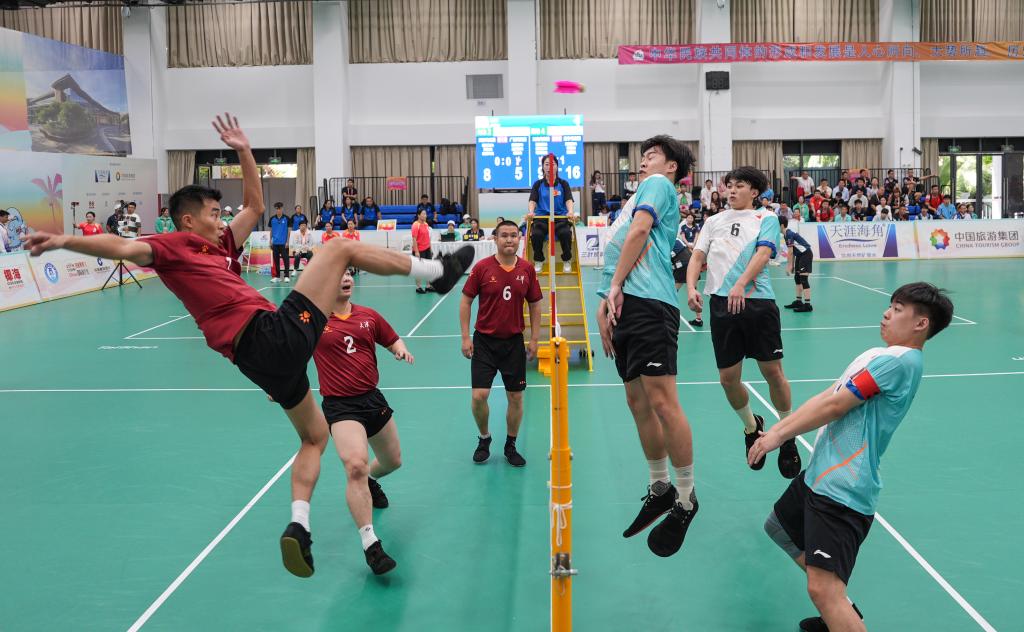 23日,第十二屆全國(guó)少數(shù)民族傳統(tǒng)體育運(yùn)動(dòng)會(huì)(以下簡(jiǎn)稱(chēng)“運(yùn)動(dòng)會(huì)”)毽球項(xiàng)目在海南三亞中瑞酒店管理職業(yè)學(xué)院開(kāi)賽,斗志昂揚(yáng)的西藏隊(duì)與沉穩(wěn)老練的香港隊(duì)在男子三人小組賽中相遇。頭球、倒鉤球、掃堂腿、腳底扣球絕殺……雙方你追我趕,觀眾看得目不轉(zhuǎn)睛。