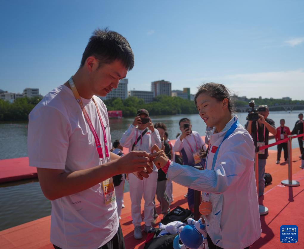 11月28日,何國潤(右)的男朋友向她求婚。當(dāng)日,在海南省三亞市舉行的第十二屆全國少數(shù)民族傳統(tǒng)體育運(yùn)動會獨(dú)竹漂女子組200米直道賽頒獎儀式后,海南隊(duì)選手何國潤的男朋友在頒獎儀式現(xiàn)場向她求婚,上演溫情一幕。新華社發(fā)(杜笑微 攝)