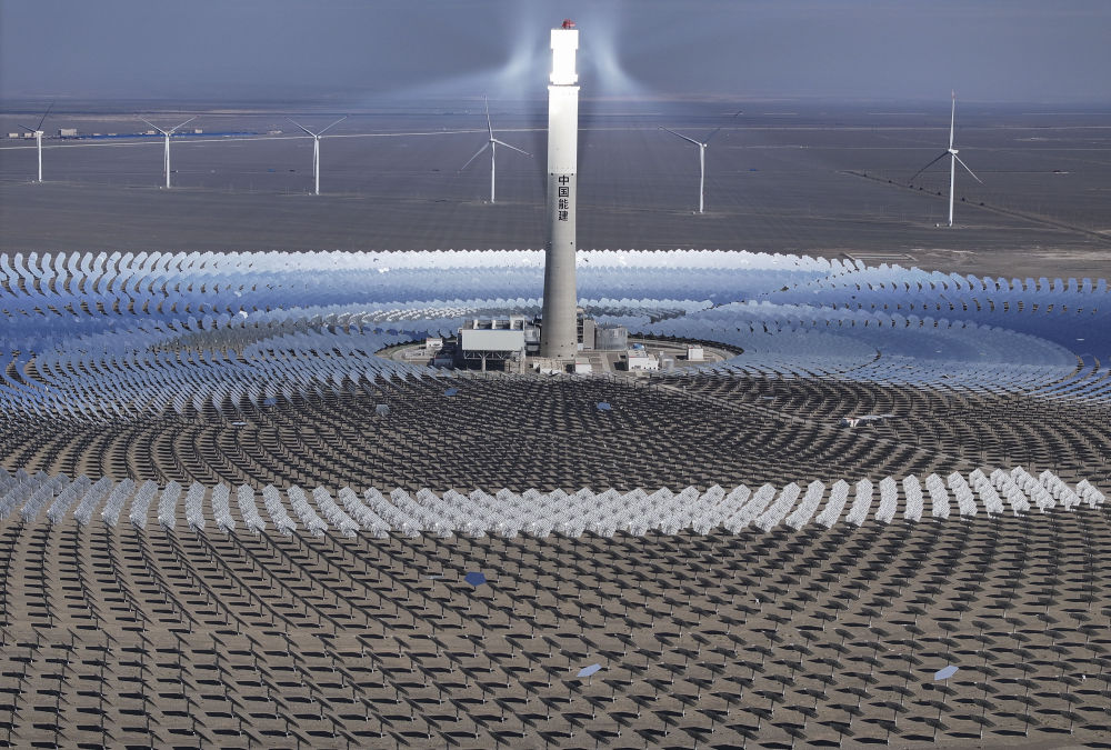 這是2024年9月12日在新疆哈密市伊吾縣淖毛湖鎮(zhèn)拍攝的國家光熱示范項(xiàng)目——熔鹽塔式50兆瓦光熱發(fā)電站(無人機(jī)照片)。新華社記者 胡虎虎 攝