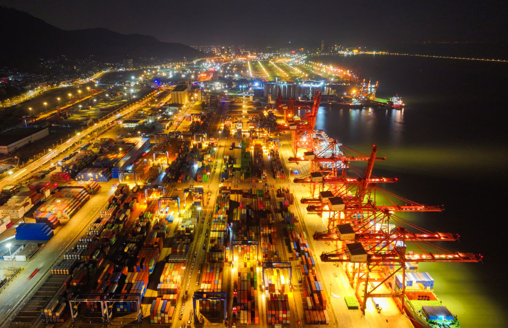 當(dāng)日,夜幕下的江蘇連云港港集裝箱碼頭燈火明亮,工作人員繁忙有序地進(jìn)行裝卸工作。臨近年末,江蘇連云港港持續(xù)提升港口集疏運(yùn)水平,多措并舉加快貨物裝卸轉(zhuǎn)運(yùn)效率,力爭外貿(mào)集裝箱吞吐量與出口量再創(chuàng)新高。