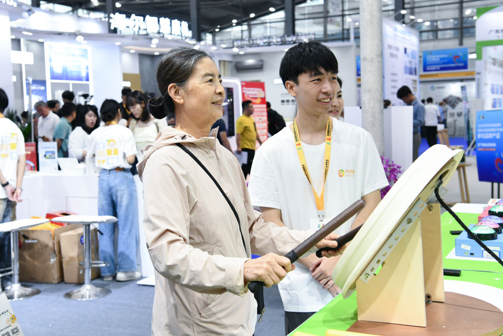 10月27日,老人在2024深圳國際智慧養(yǎng)老產(chǎn)業(yè)博覽會(huì)上體驗(yàn)樂齡鼓。(新華社記者 梁旭 攝)