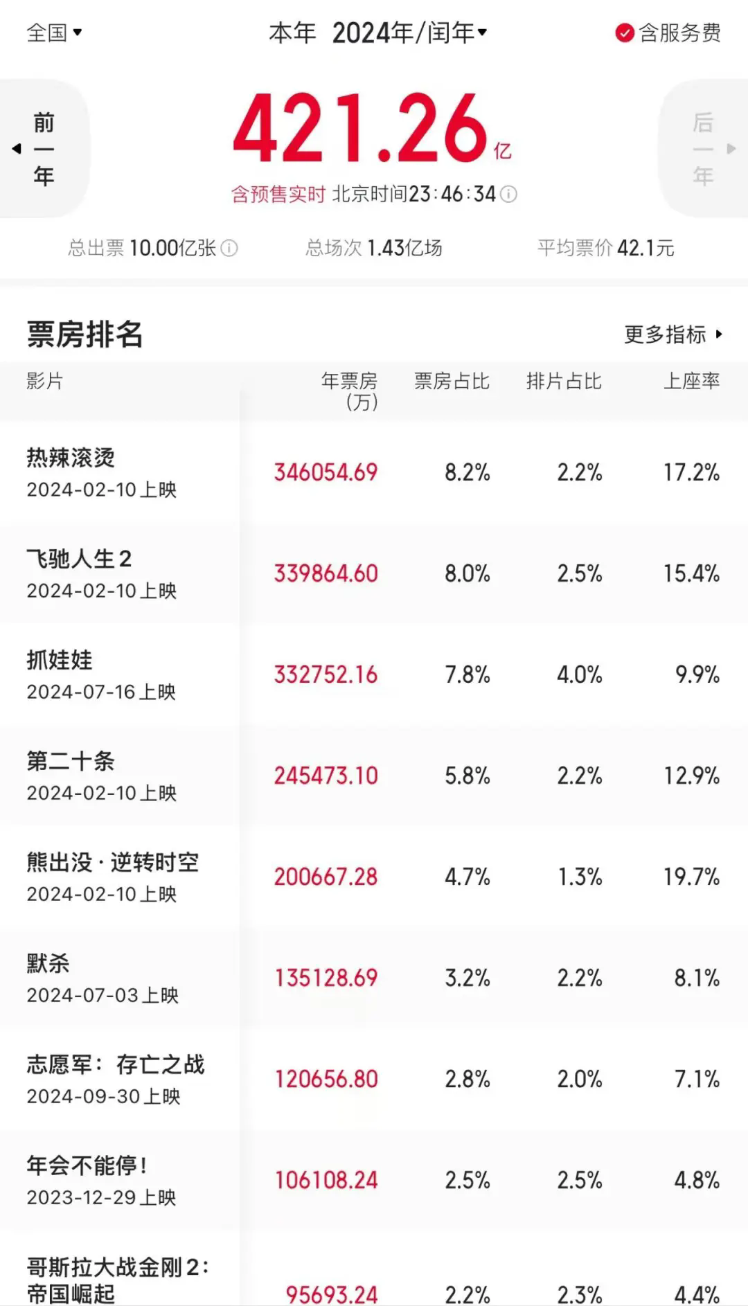 《抓娃娃》領(lǐng)跑2024年觀影人次榜