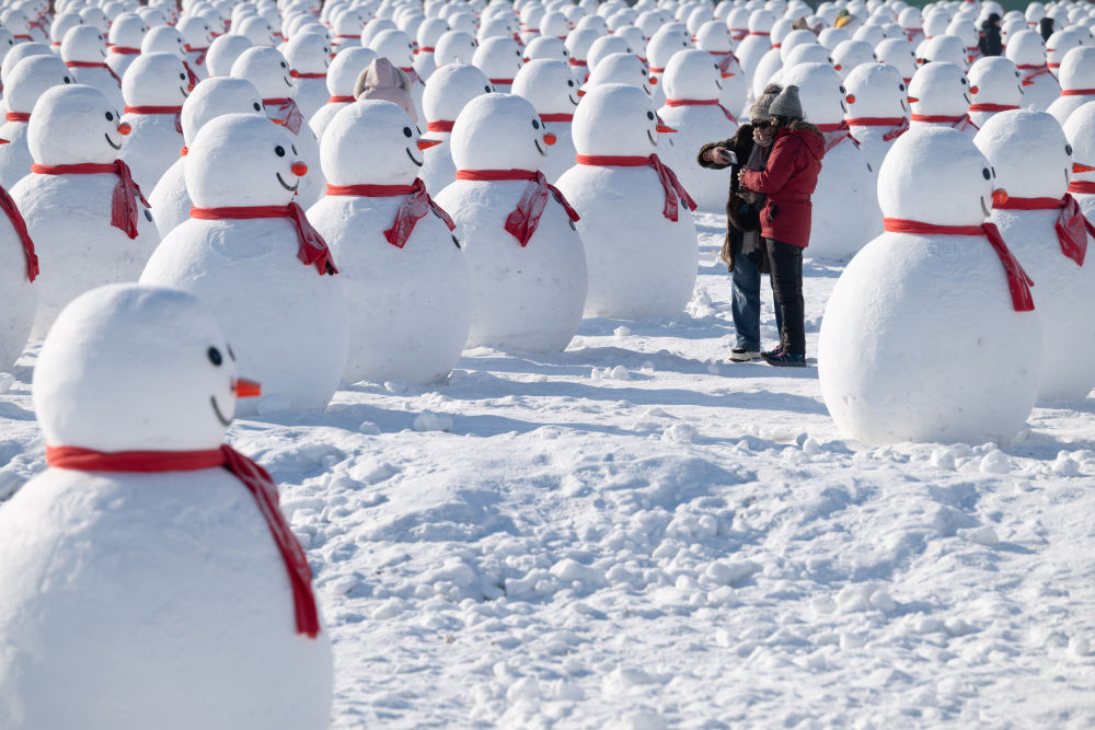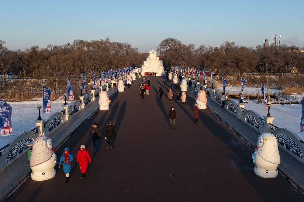 1月3日,在哈爾濱太陽島雪博會園區(qū)入口,游客經(jīng)過“雪人儀仗隊(duì)”(無人機(jī)照片)。