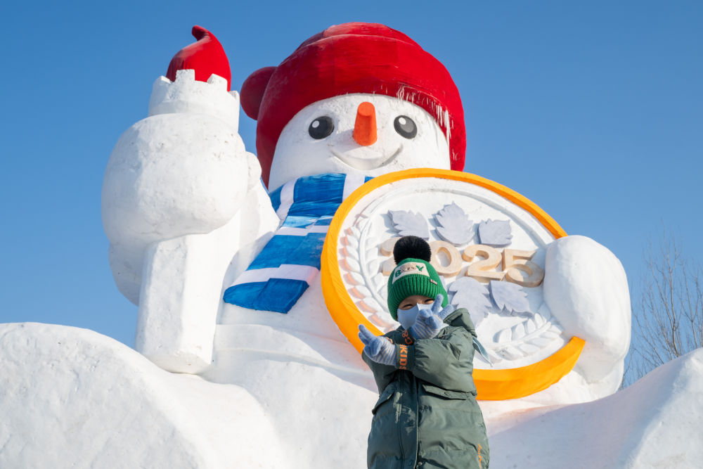 1月3日,在哈爾濱冰雪大世界園區(qū),游客與亞冬會吉祥物雪雕“妮妮”合影。