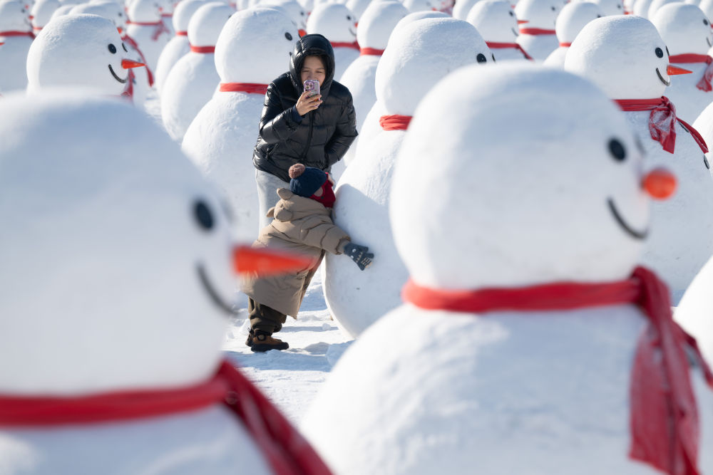 1月3日,在哈爾濱市道里區(qū)群力大道,游客在一家商場前的“雪人軍團(tuán)”處游玩。