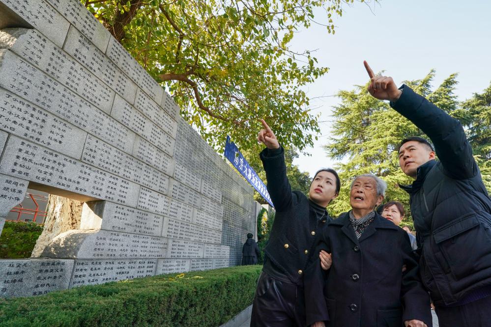 在南京大屠殺死難者家庭祭告活動中,艾義英(右二)和家人在侵華日軍南京大屠殺遇難同胞紀念館的“哭墻”上尋找家人姓名(2024年12月1日攝)。新華社記者 李博 攝