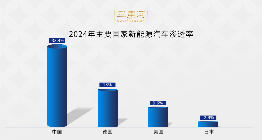 崔東樹(shù)提供的數(shù)據(jù)顯示,2024年,中國(guó)新能源汽車(chē)滲透率達(dá)到38.4%,德國(guó)達(dá)到18%,美國(guó)僅有9.6%,日本僅有約3%。世界汽車(chē)產(chǎn)業(yè)格局正發(fā)生變化。