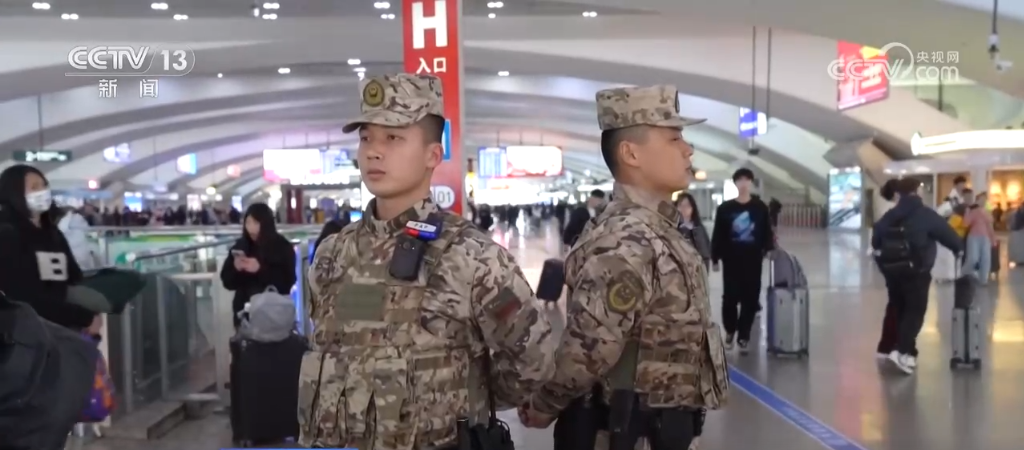 央視網(wǎng)消息:春運期間,全國各地旅客出行顯著增加,擔(dān)負(fù)執(zhí)勤任務(wù)的武警部隊官兵堅守執(zhí)勤一線,科學(xué)進(jìn)行人員編組,在機場、高鐵等人流聚集處加強警戒、疏導(dǎo)巡邏,為旅客安全出行保駕護(hù)航。