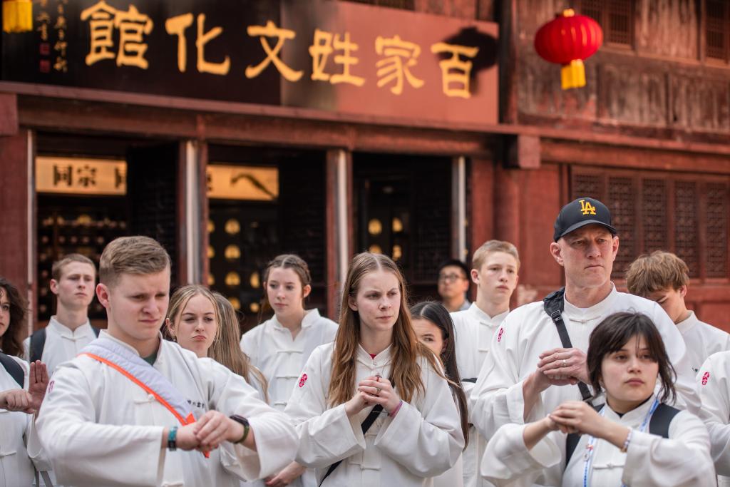 2024年3月22日,美國華盛頓州中學(xué)生代表團成員在武當(dāng)山學(xué)習(xí)如何抱拳。新華社記者 伍志尊 攝