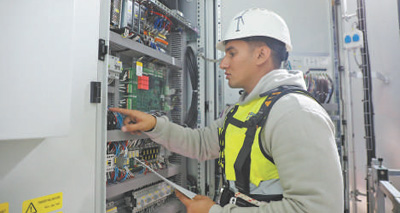 埃及工程師馬哈茂德·穆罕默德正在風(fēng)機(jī)內(nèi)部進(jìn)行電氣檢查。