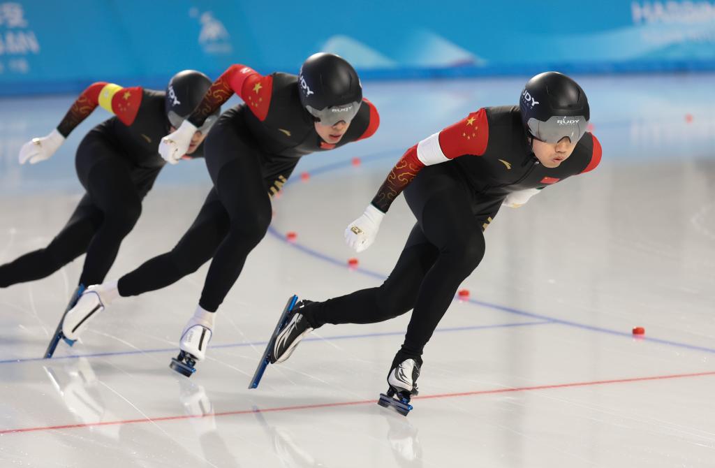 2月10日,中國隊(duì)選手高亭宇(右)、寧忠?guī)r、廉子文(中)在比賽中。當(dāng)日,第九屆亞冬會速度滑冰男子短距離團(tuán)體追逐賽在哈爾濱舉行。中國隊(duì)獲得冠軍。新華社記者 呂帥 攝