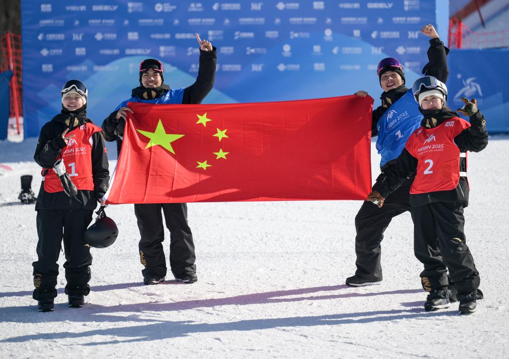 2月10日,中國選手張小楠、楊文龍、姜鑫杰與熊詩芮(從左至右)在比賽后慶祝。當(dāng)日,在亞布力舉行的第九屆亞冬會單板滑雪女子大跳臺決賽中,中國選手熊詩芮奪冠,張小楠獲得亞軍;在男子大跳臺決賽中,中國選手楊文龍奪冠,姜鑫杰獲得亞軍。新華社記者 牟宇 攝