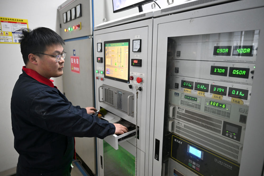 1月8日,在河南省科學(xué)院(沁陽(yáng))科創(chuàng)園,焦作同輻科技有限責(zé)任公司工作人員查看電子加速器系統(tǒng)運(yùn)行狀態(tài)。
