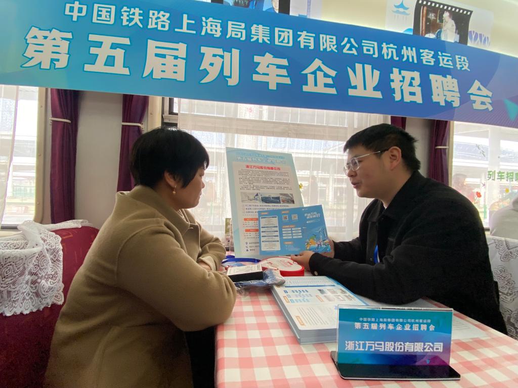 杭州客運段甬廣車隊黨總支書記朱秦予介紹,當(dāng)天除了在K210次列車設(shè)置企業(yè)一對一招聘臺,列車工作人員還通過網(wǎng)絡(luò)直播,在西安開往寧波的K468次、蘭州開往杭州的T114次等列車上同步開展線上招聘會,為更多旅客提供崗位選擇。