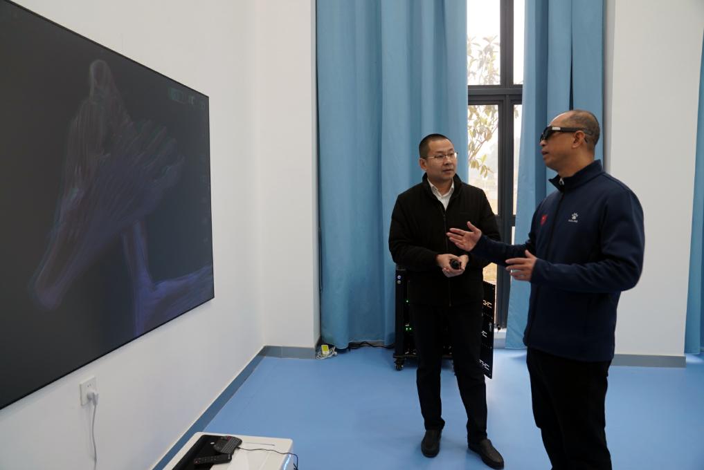 2月17日,在廣西體育高等??茖W校,韋軍與運動健康學院的老師交流,了解3D模擬運動解剖模型如何助力教學。新華社記者 陳露緣 攝
