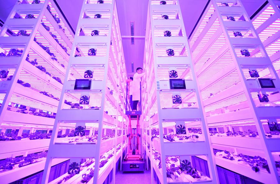 科技人員在中國農(nóng)業(yè)科學(xué)院都市農(nóng)業(yè)研究所智能植物工廠觀察農(nóng)作物生長情況(2024年10月16日攝)。新華社記者 劉坤 攝