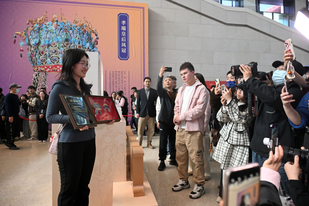 當(dāng)日,國(guó)博文創(chuàng)團(tuán)隊(duì)將“紀(jì)念款鳳冠冰箱貼”和紀(jì)念證書(shū)贈(zèng)送給第100萬(wàn)件鳳冠冰箱貼的購(gòu)買(mǎi)者——來(lái)自山東東營(yíng)的“95后”觀眾李雅菲。
