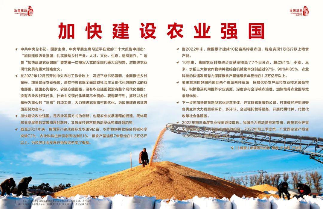 ◆ 在2022年12月召開的中央農(nóng)村工作會議上,習(xí)近平總書記強調(diào),全面推進鄉(xiāng)村振興、加快建設(shè)農(nóng)業(yè)強國,是黨中央著眼全面建成社會主義現(xiàn)代化強國作出的戰(zhàn)略部署。強國必先強農(nóng),農(nóng)強方能國強。沒有農(nóng)業(yè)強國就沒有整個現(xiàn)代化強國;沒有農(nóng)業(yè)農(nóng)村現(xiàn)代化,社會主義現(xiàn)代化就是不全面的。要鉚足干勁,抓好以鄉(xiāng)村振興為重心的“三農(nóng)”各項工作,大力推進農(nóng)業(yè)農(nóng)村現(xiàn)代化,為加快建設(shè)農(nóng)業(yè)強國而努力奮斗。