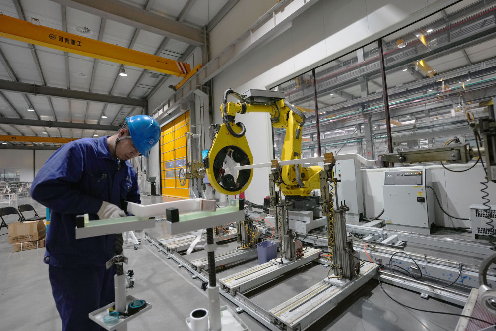 2月26日,在哈爾濱電機廠有限責任公司線圈分廠智能制造車間,工人與智能設備在進行協同加工生產作業(yè)。新華社記者 王松 攝