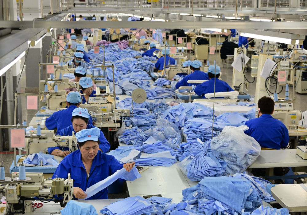 3月25日,山東青島即墨區(qū)即發(fā)工業(yè)園內一家服裝企業(yè)的職工在使用智能縫紉機進行生產。新華社記者 李紫恒 攝